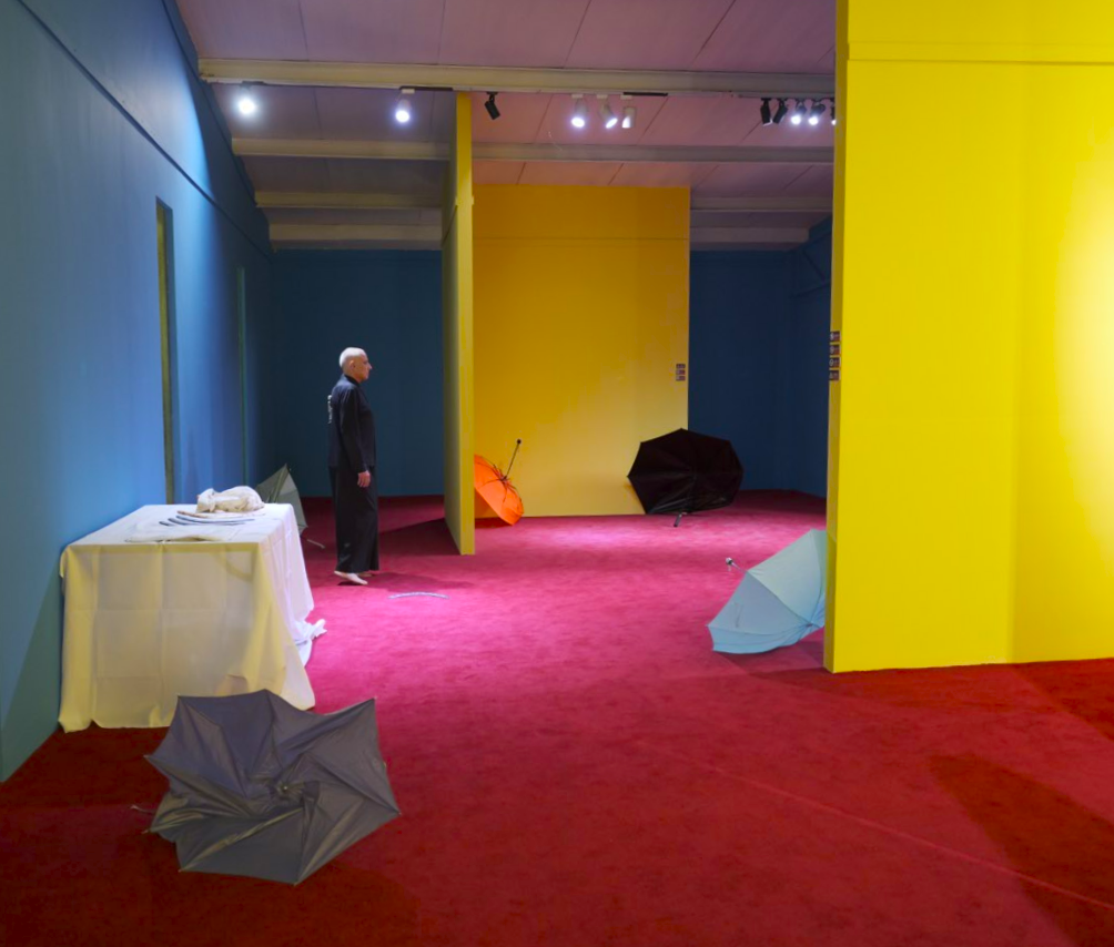 The final action is carried out by wiping all the texting off the floor and shirts are taken off the walls. The fog slowly evaporates and the space shows itself again. [PB]