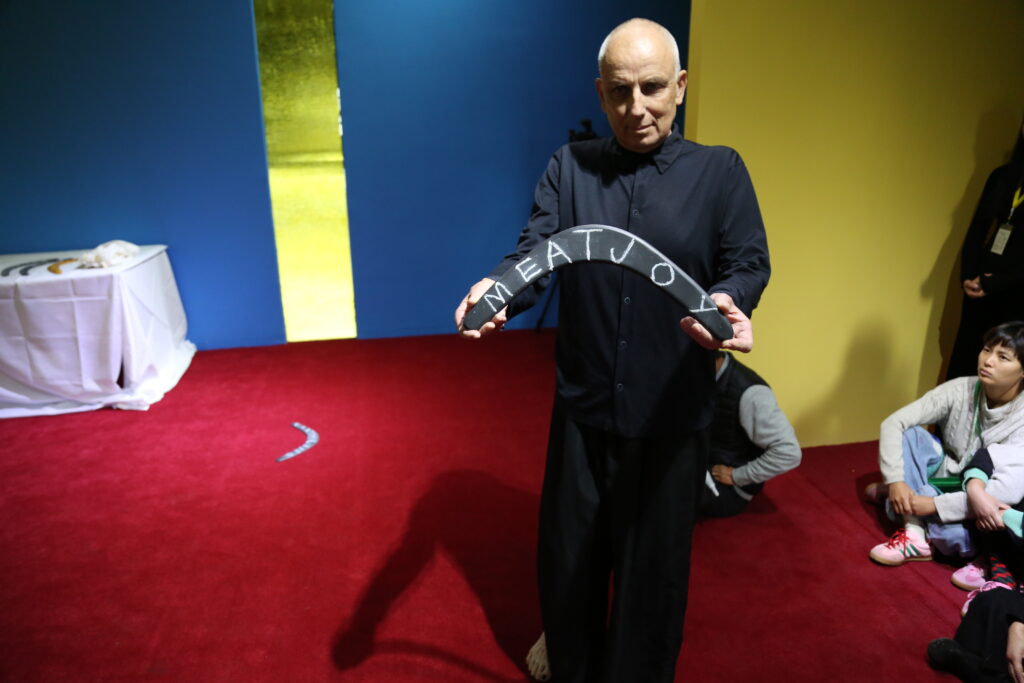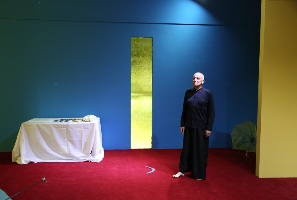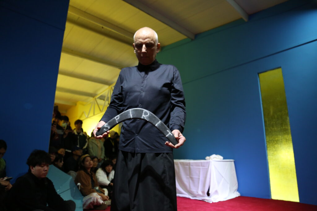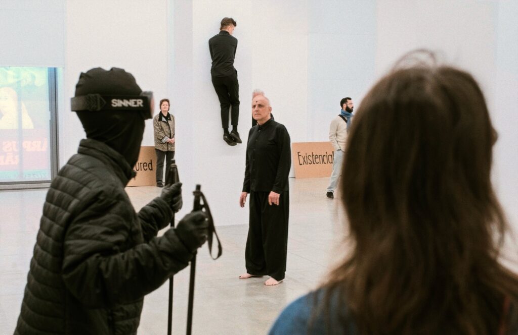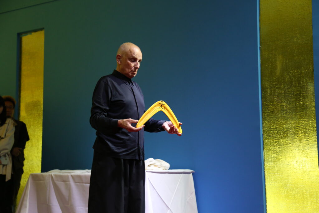Cardboard signs with inscriptions are placed along the walls of the room, which gives me an immersive feeling – as if the white walls of “Zuzeum” were a skull and I had now entered the inside of my own head. The feeling is reinforced by various words (e.g. spirit, meatjoy) adorning black boomerangs on a table at one end of the hall, next to them is a pile of white embroidery with messages of a different nature (I noticed the word HOPE). In addition to the skier, there are other images in the room, which are more reminiscent of works of art – one of them literally, hanging about two meters above the ground on the wall of the space. They are all united by a mystical soundscape – exactly as scary and incoherent as dreams and sometimes thoughts usually are. At the end of the performance, the skier leaves his skis in the hall and walks back into the yard; I follow him without hesitation, because I don’t want to stay in my head for too long. The memento mori theme continues in its own right in the next performance titled “End of days”, however, the atmosphere in the room has become much brighter.