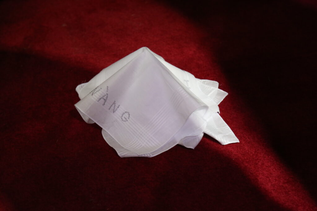 a white handkerchief is taken from a pocket…stretched arm…and dropped…