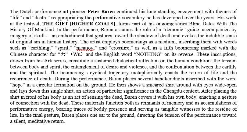 THE GIFT [HIGHER GOALS] first version. NongYuan Art Gallery, Nongyuan Art Village, Chengdu. 13th UP-ON Live Art festival. This performance is dedicated to Yama Kowa and the human condition. Photos: Feng Feifei, Sun Xiaolei. The fragment below of my performance is part of the article by Guicheng LIU: The Dramaturgy and the Site of 13th UP-ON Live Art Festival: The Practice of Social, Non-Human and Caring. Published in Art Monthly. December 2025.